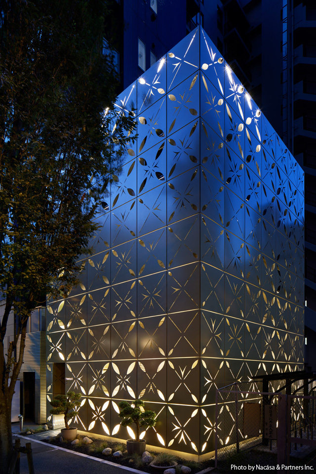 The exterior panels, designed by Takenaka Corporation, are intended to evoke traditional andon, hanging lanterns with paper shades, which were used to light the streets at night. This has been achieved by combining Edo komon (small, repeated patterns) with traditional French patterns. Each panel has a thickness of 2mm and a size of 1100mm x 1100mm, with a joint width of 15mm. Each of the approximately 150 panels (covering a 200m² area) has a slightly different pattern, made possible using state-of-the-art CAD.