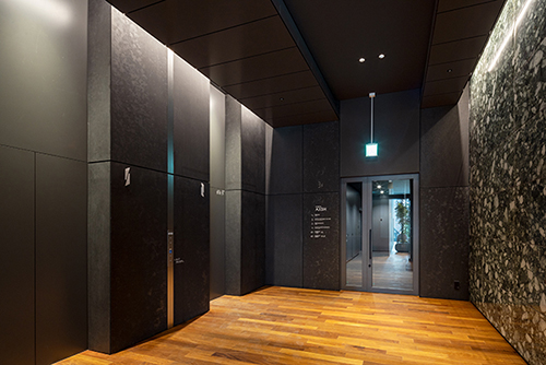 黒の濃淡でランダムな結晶模様を表出するりん酸仕上げ。木材や石、植栽などの