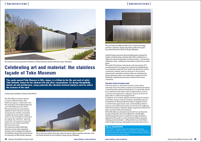 ステンレススチールに関する技術情報を発信する海外雑誌「Stainless Steel World」2025年10月号にて、当社の施工事例「岐阜現代美術館 桃紅館」が紹介されました。