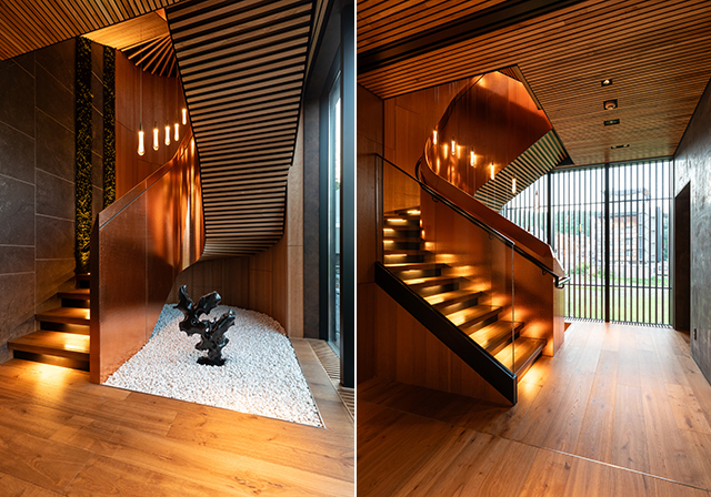 ヴィラの1~4階までの各階を繋ぐ螺旋階段は、高さ1.1mの手摺壁をアルミの槌目加工仕上げで製作。ブロンズ色のカラークリア塗装を施し、木目調の内装と調和する温かみのある空間を創り上げています。