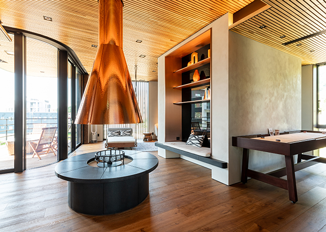 ヴィラ3階のメインリビングに設置された円形の薪ストーブでは、直径1m、円錐台形状の煙突カバーを製作。こちらは銅板に槌目+ミガキ加工+クリア塗装を施し、銅のもつ鮮やかな色味と輝きを引き出しています。煙突本体や天井といった取り合う他工事との調整も行いながら、室内を彩る存在感のある製品を納めました。