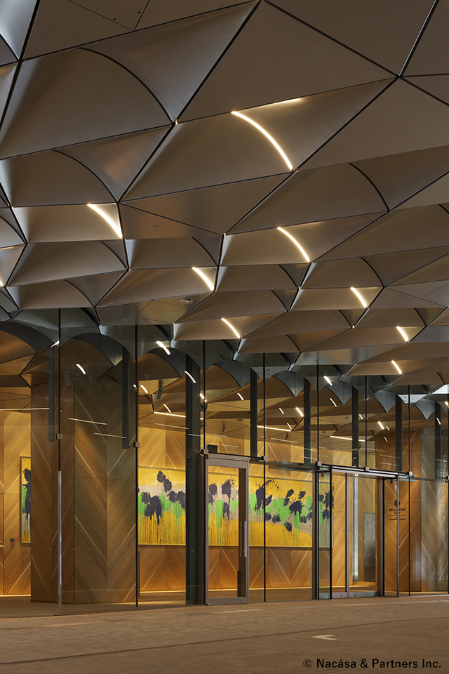 1階屋外貫通通路・ホテルエントランス前のバス乗降場の天井は、円錐形を縦半分に切ったような、アーチのかかった三角形のパネルを250枚並べて構成。水面のさざ波をイメージしており、立体感のある幾何学模様が来場者にインパクトを与えます。