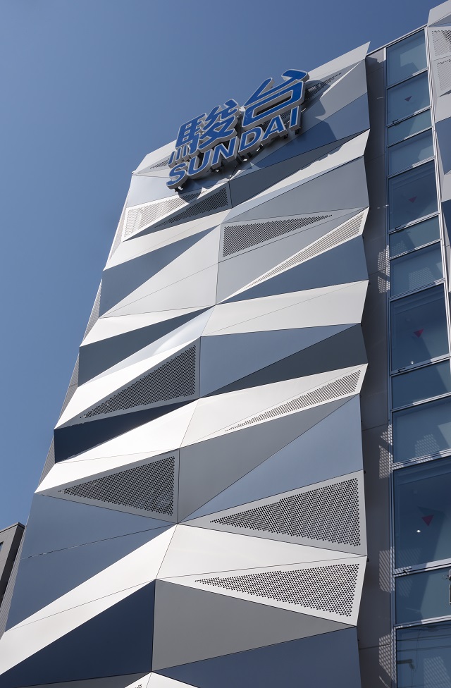 この新校舎は、駿台予備学校が柏の地に誕生してから25年が経過した旧校舎から移転・新築されたもの。「自宅よりも校舎で勉強したい」と思える学校づくりを目指す学園の考えを、箇所によって奥行きが発生する三次元状の外装パンチングパネルでお手伝いさせていただきました。