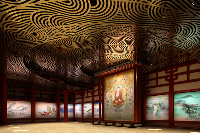 染色ゴールドアルマイト仕上げの光輝合金天井パネル(薬師寺食堂)