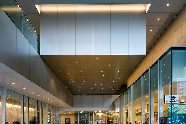 周囲の景色を柔らかく映し込む、光輝合金発色パネルの下がり壁事例