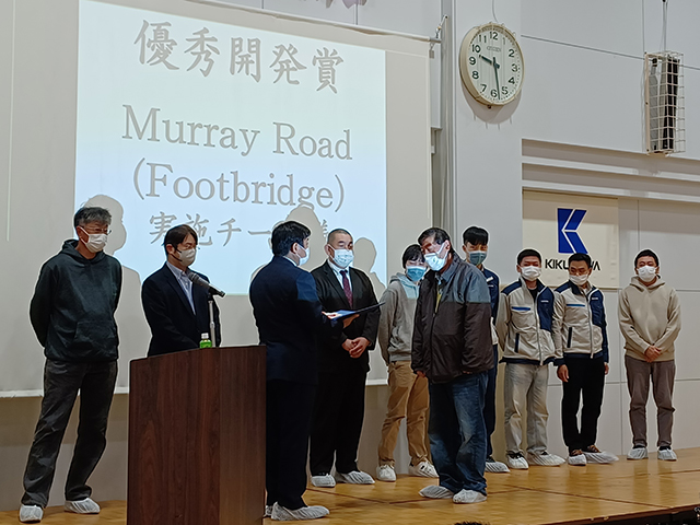 永年勤続表彰や優秀社員表彰のほか、この1年間の全てのプロジェクトのうち製造過程や完成度の面で成果を残したプロジェクトが選ばれ、優秀工事として表彰されました。