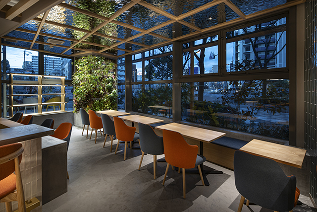 大阪・中津駅近くにオープンしたホテル「The GALA Hotel Umeda」。カフェ&バー併設の1Fロビーの天井に水面パネルをご採用いただきました。水面パネルが格子状の木枠とともに配置された、目を引くデザインです。